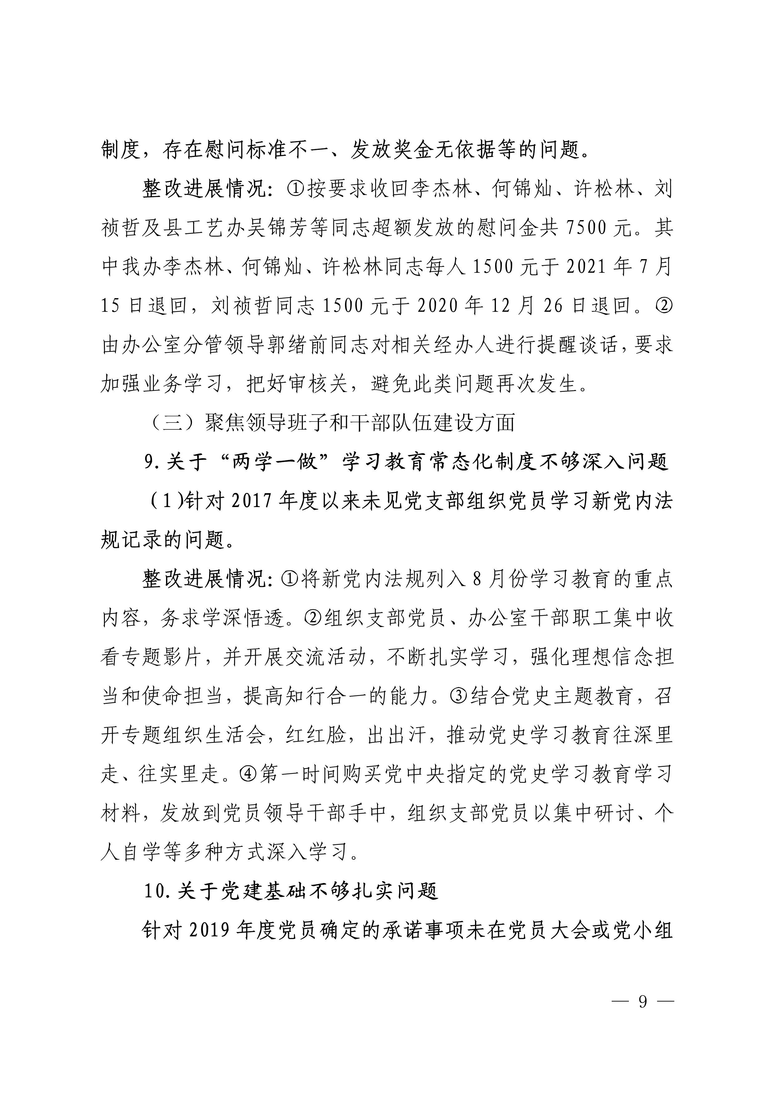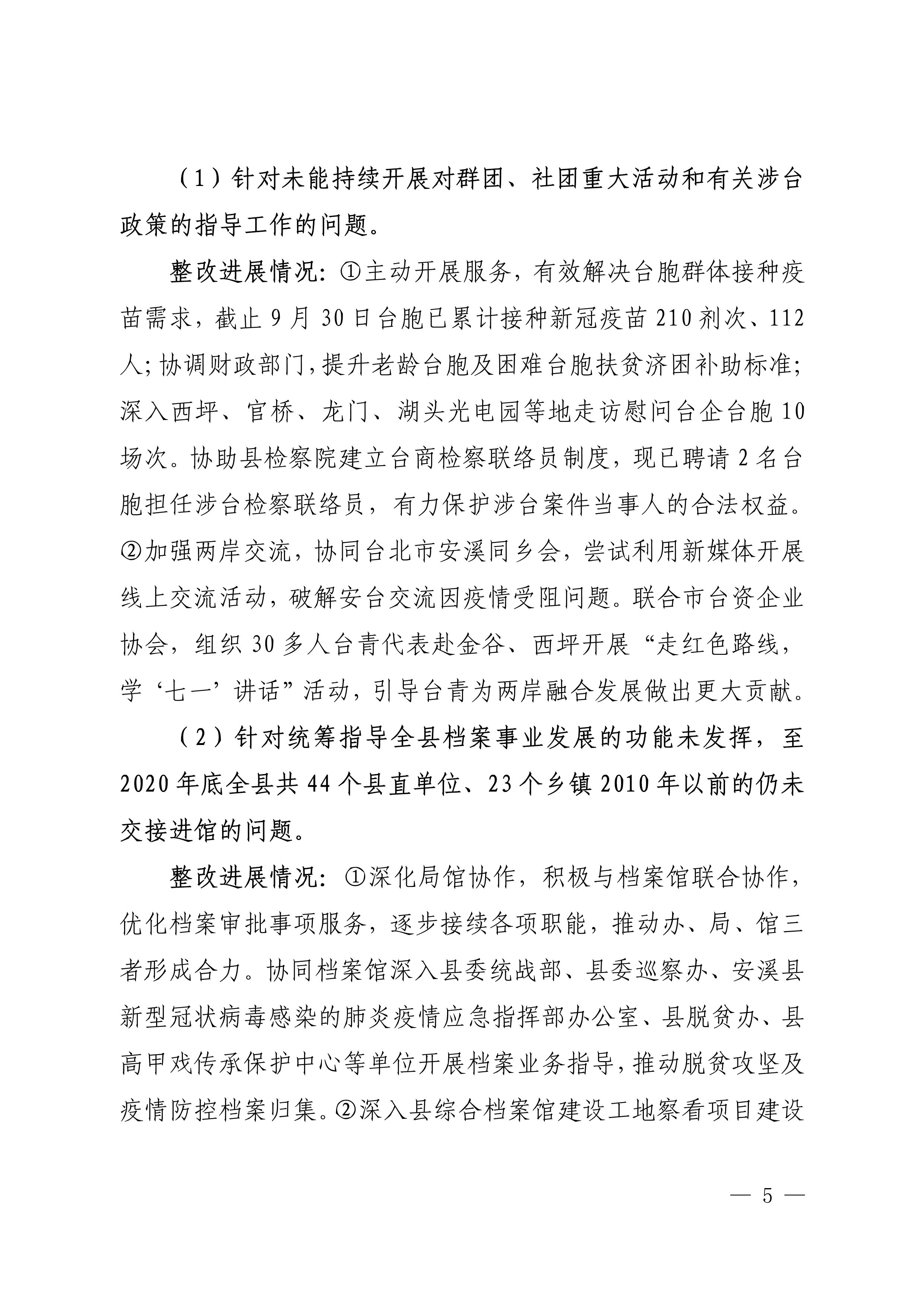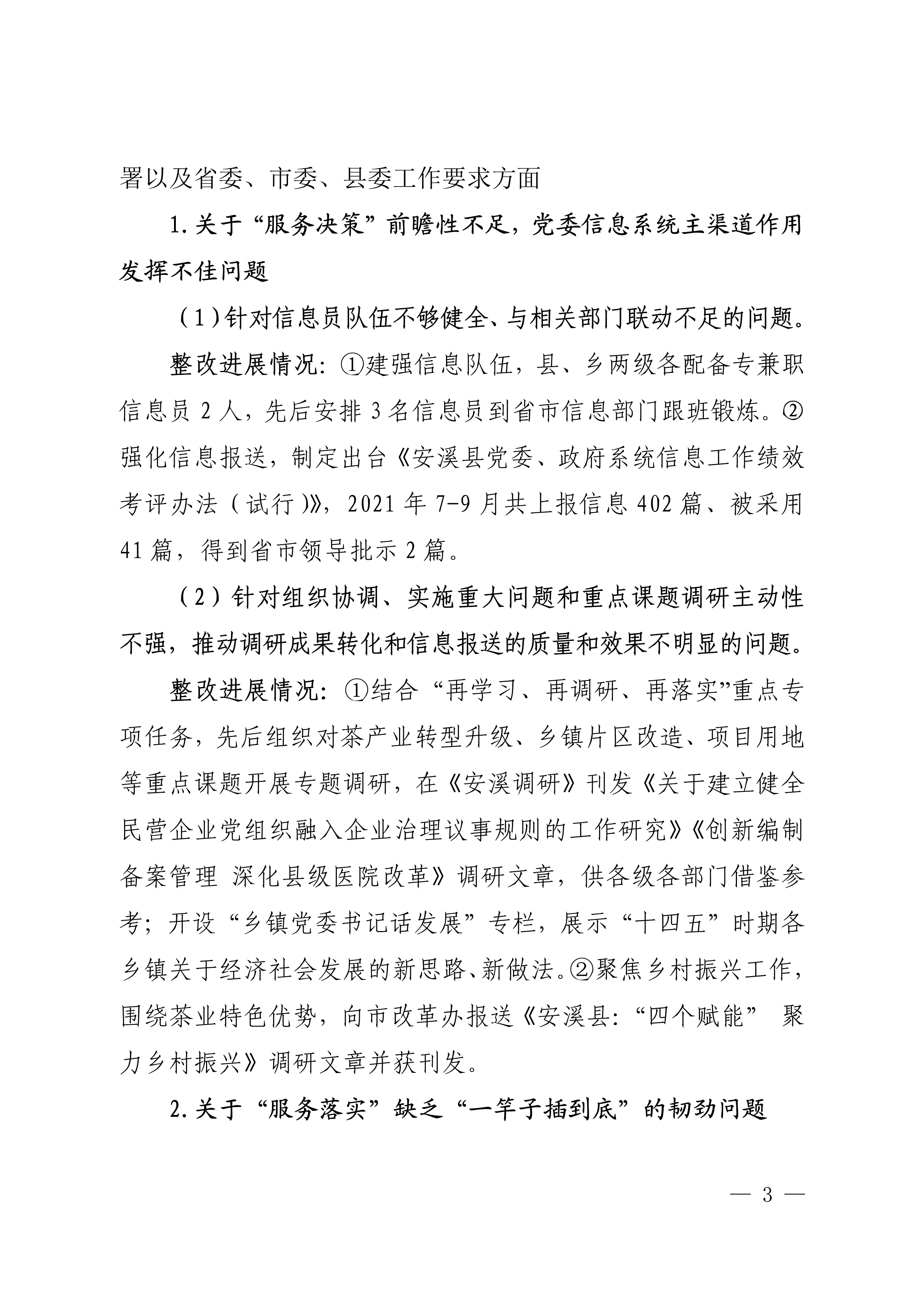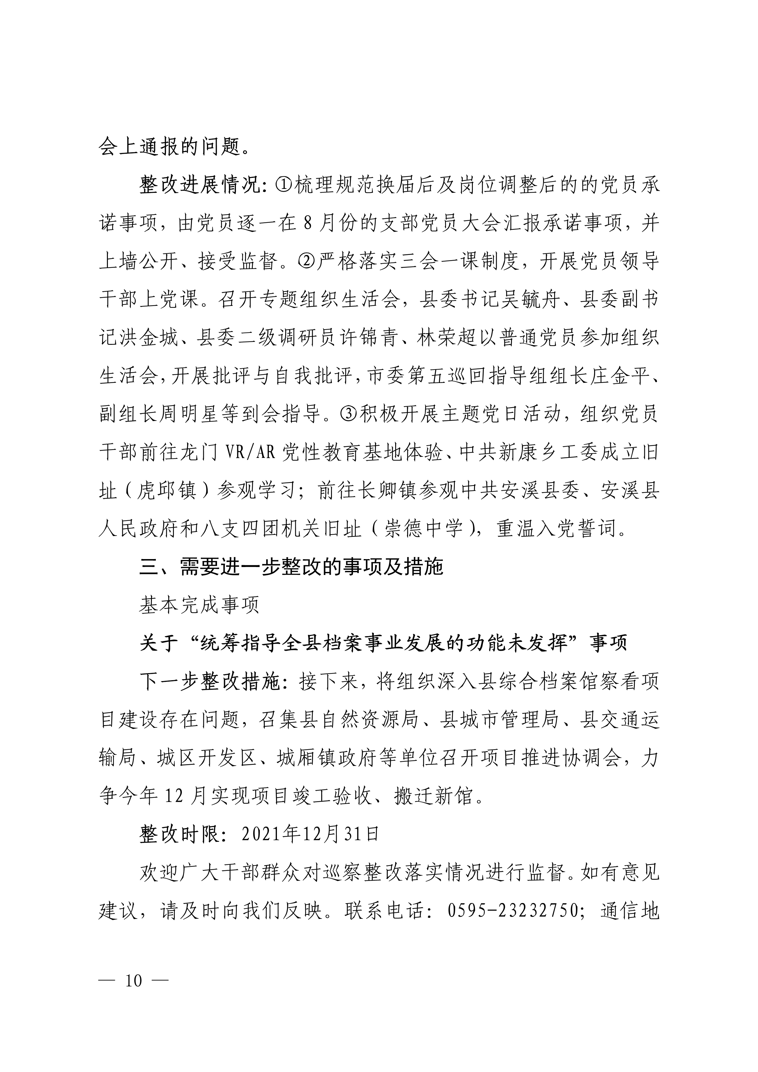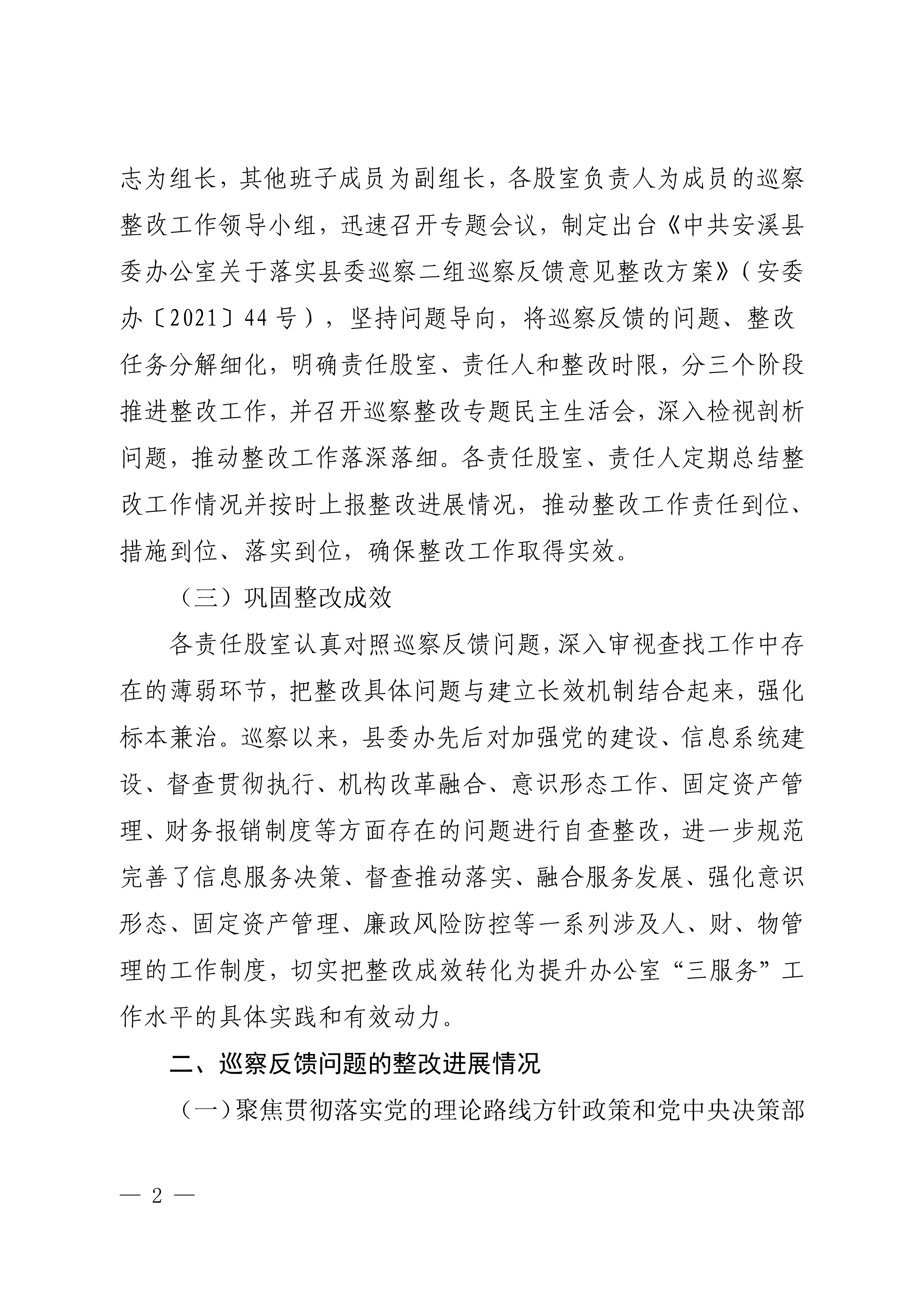 中共安溪县委办公室关于巡察整改进展情况的通报