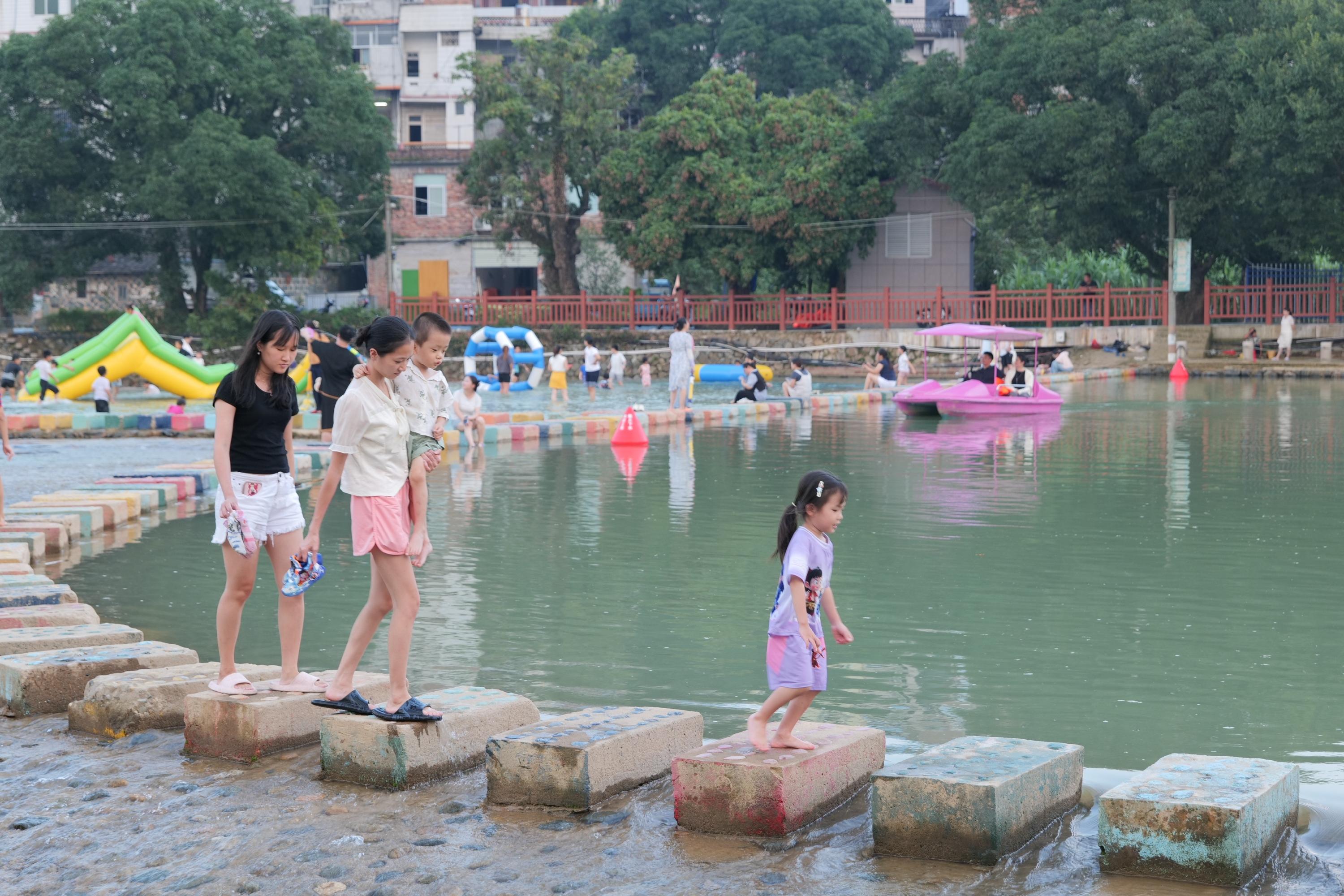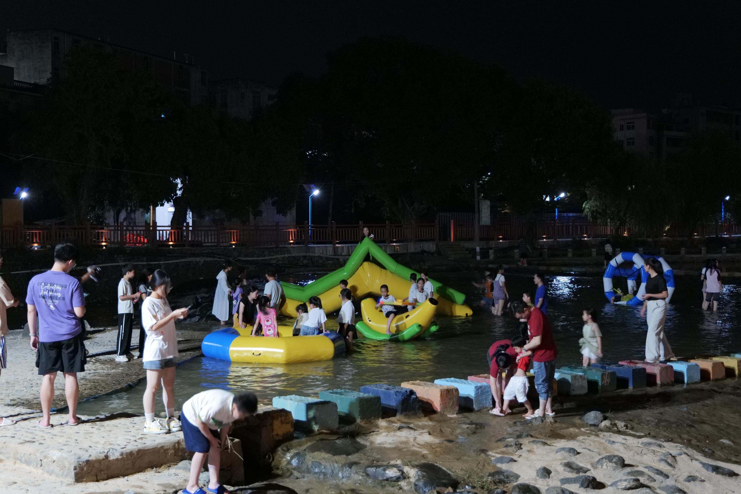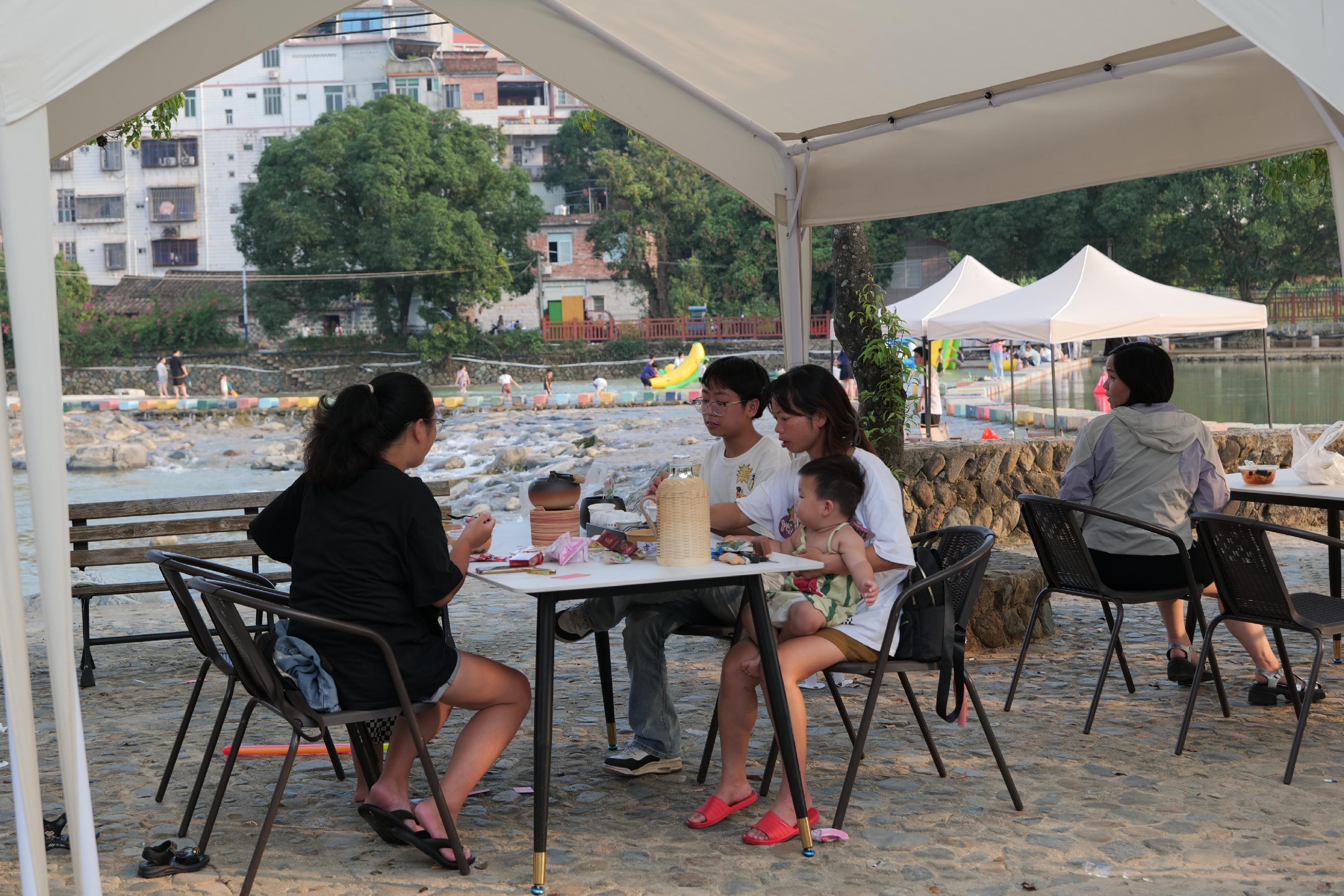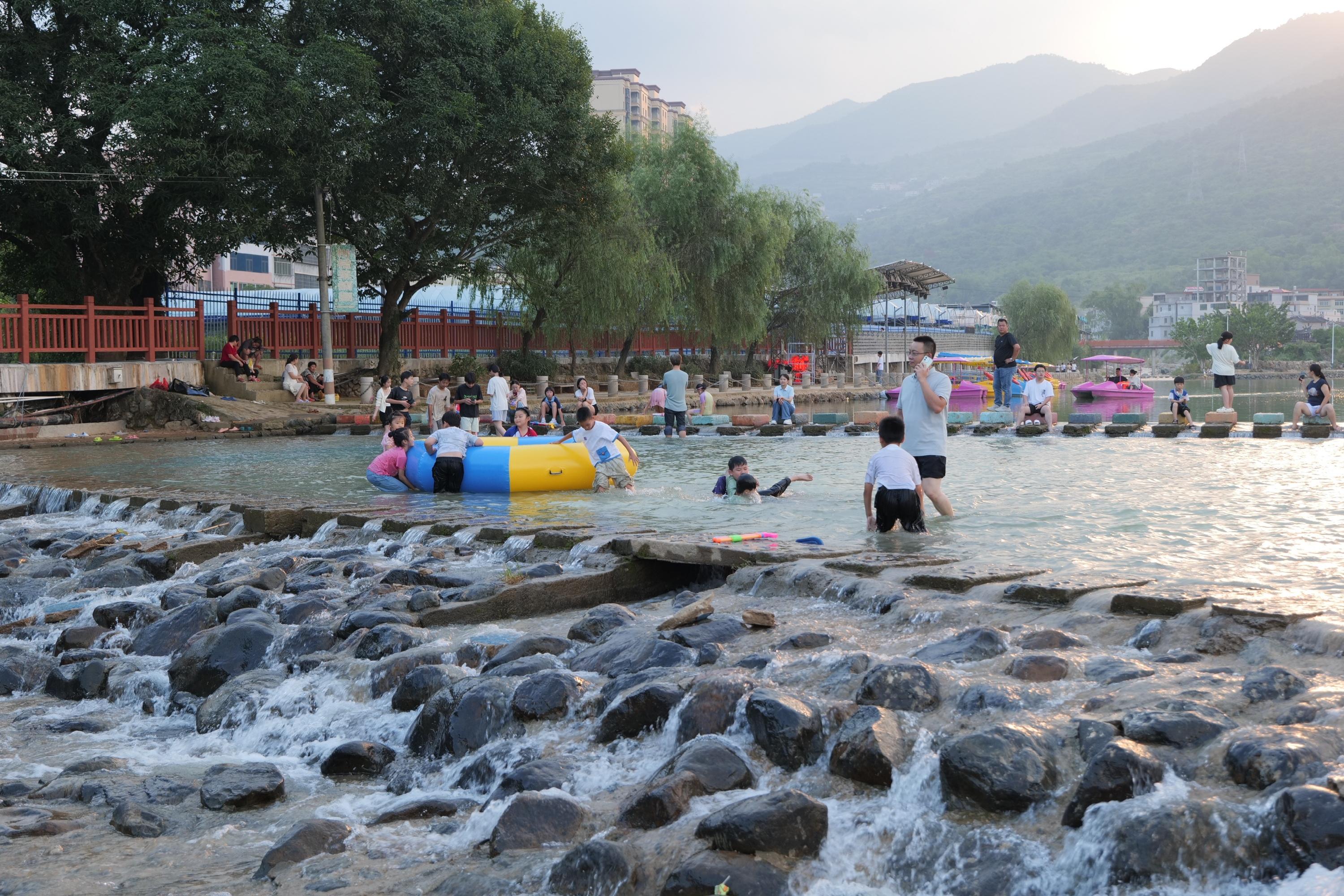 活动当天,尽管是假期首日,现场已迎来不少“尝鲜”的游客。孩子们在水上乐园中追逐嬉戏,水花四溅中洋溢着欢声笑语;一家大小登上游船,沿溪缓缓而行,两岸的稻田与古朴民居构成一幅流动的田园画卷;也有游客悠闲地安坐于亲水帐篷之下,感受脚下溪水带来的沁凉,享受难得的惬意时光。