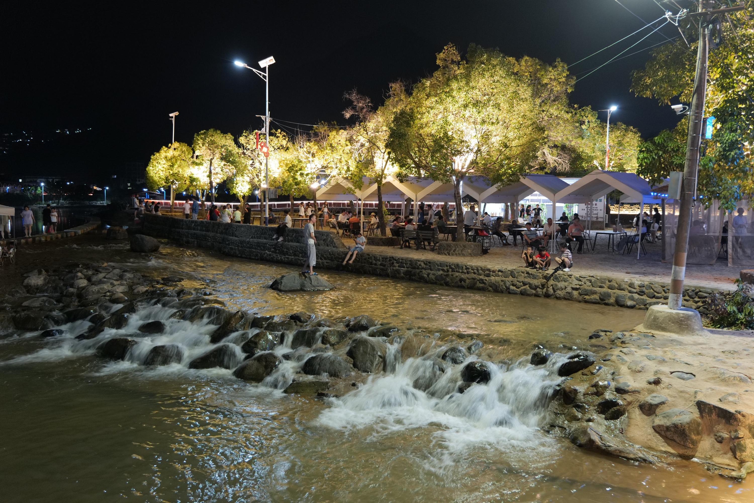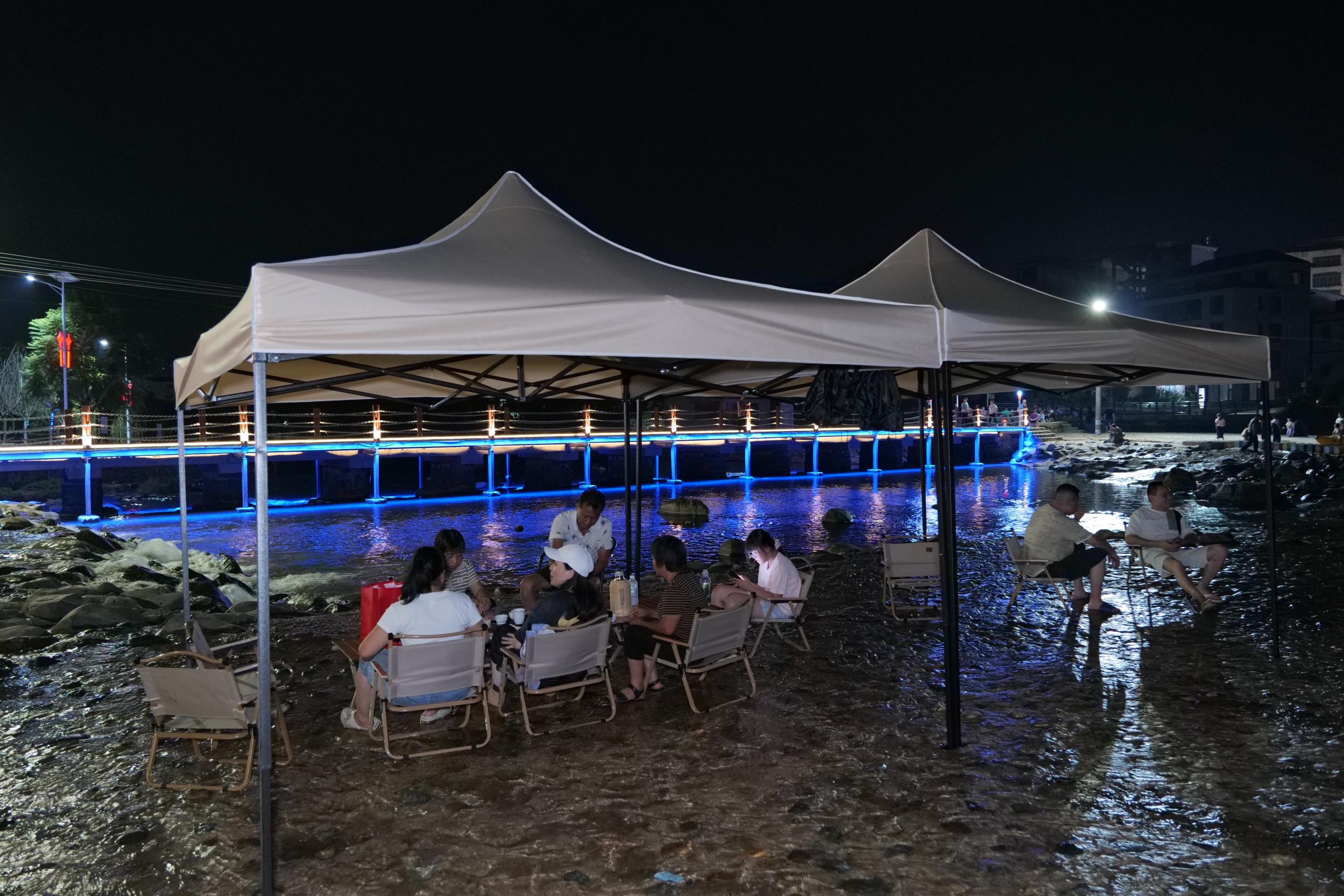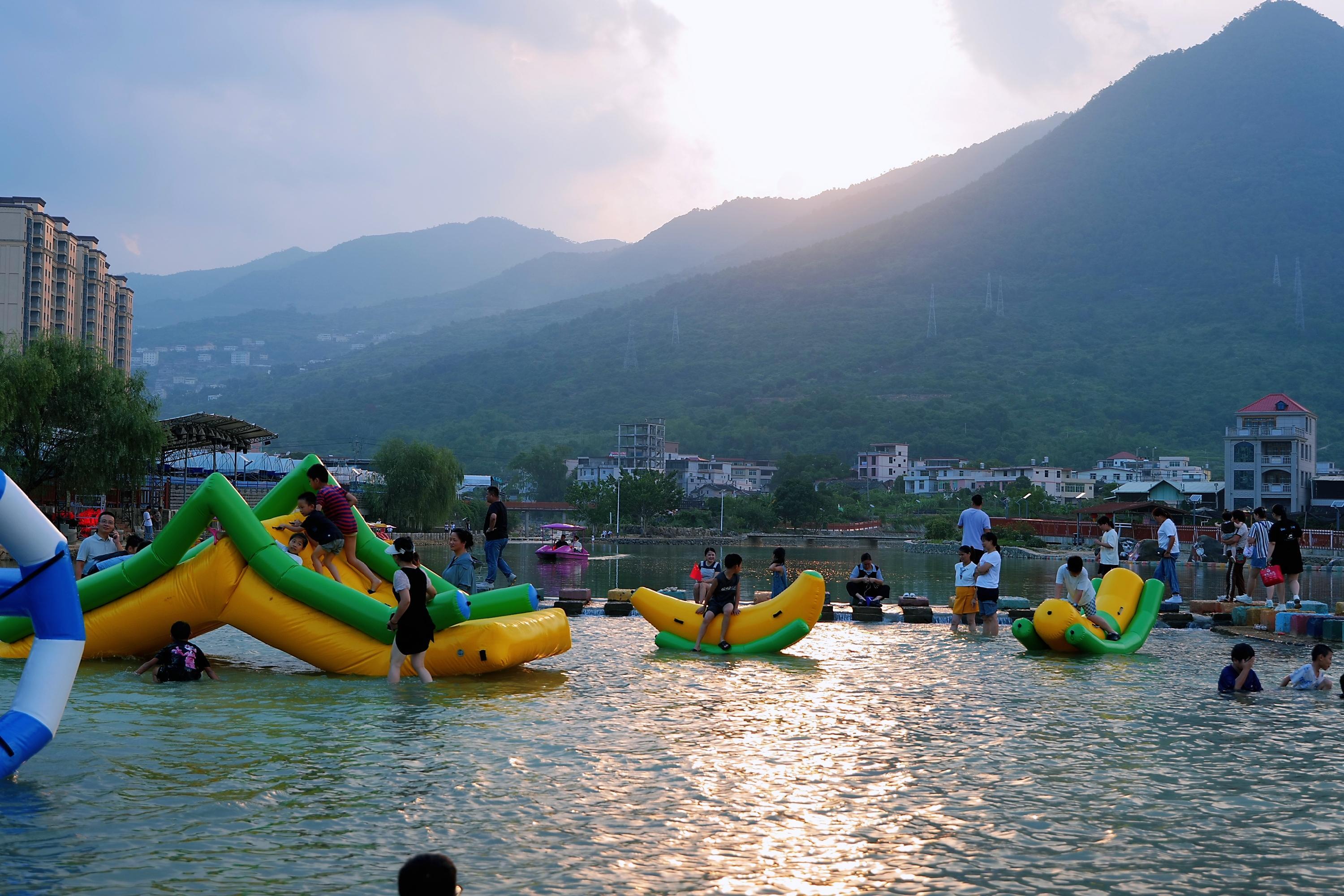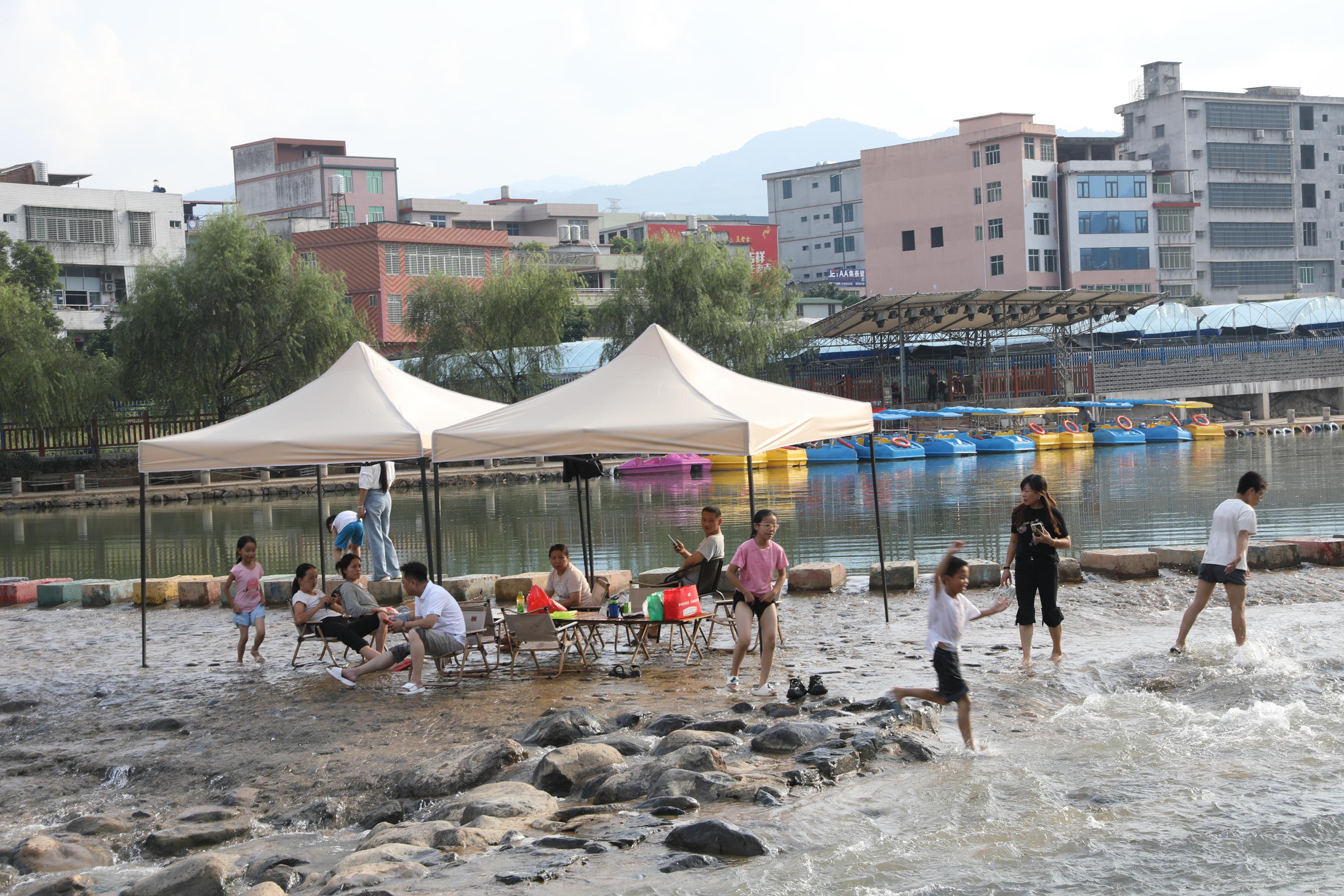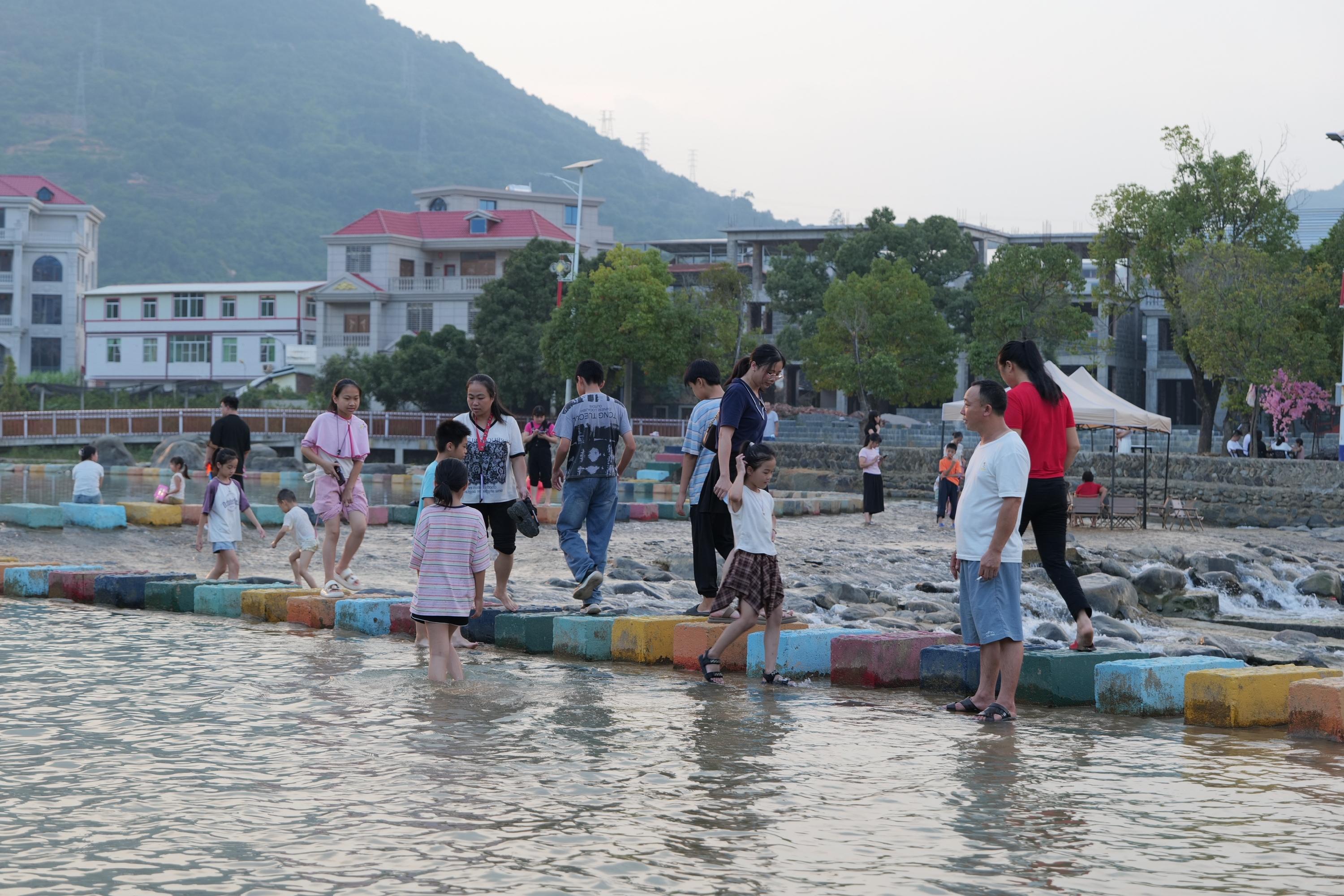 活动当天,尽管是假期首日,现场已迎来不少“尝鲜”的游客。孩子们在水上乐园中追逐嬉戏,水花四溅中洋溢着欢声笑语;一家大小登上游船,沿溪缓缓而行,两岸的稻田与古朴民居构成一幅流动的田园画卷;也有游客悠闲地安坐于亲水帐篷之下,感受脚下溪水带来的沁凉,享受难得的惬意时光。